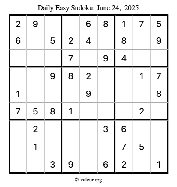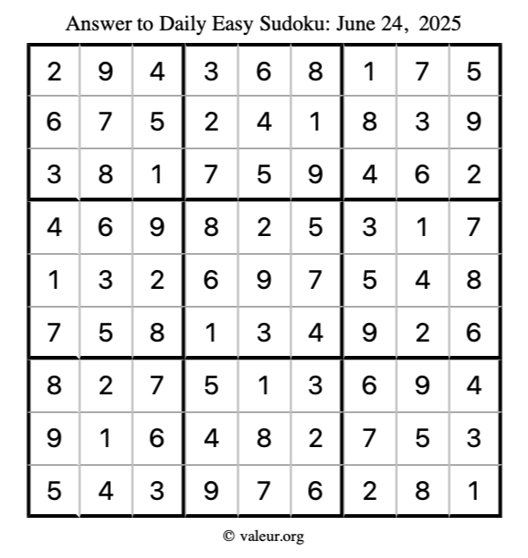 Here is the June 24, 2025 easy sudoku puzzle. You are welcome to print a copy to solve by hand. For your convenience, we have also included the solution further down the page so you can check your work.