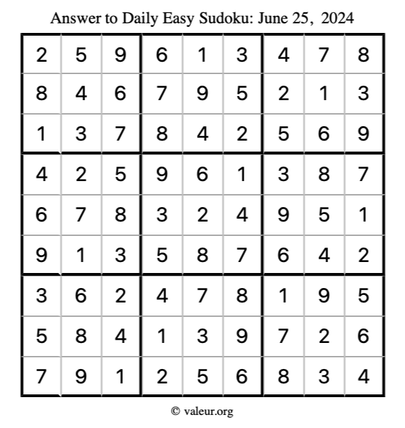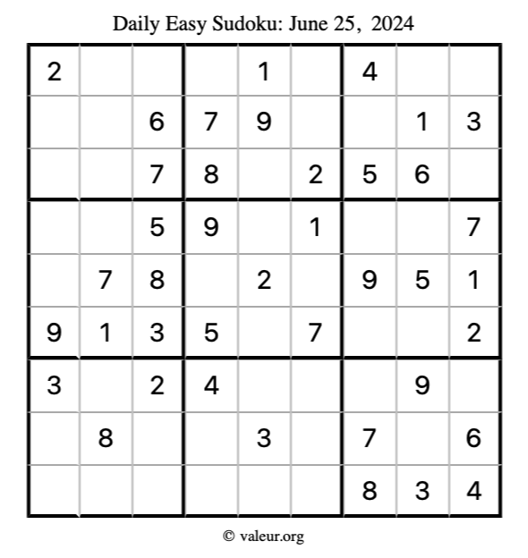 Here is the June 25, 2024 easy sudoku puzzle. You are welcome to print a copy to solve by hand. For your convenience, we have also included the solution further down the page so you can check your work.