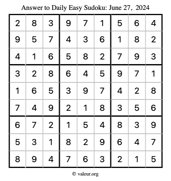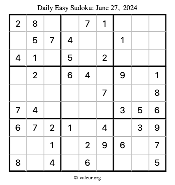 Here is the June 27, 2024 easy sudoku puzzle. You are welcome to print a copy to solve by hand. For your convenience, we have also included the solution further down the page so you can check your work.