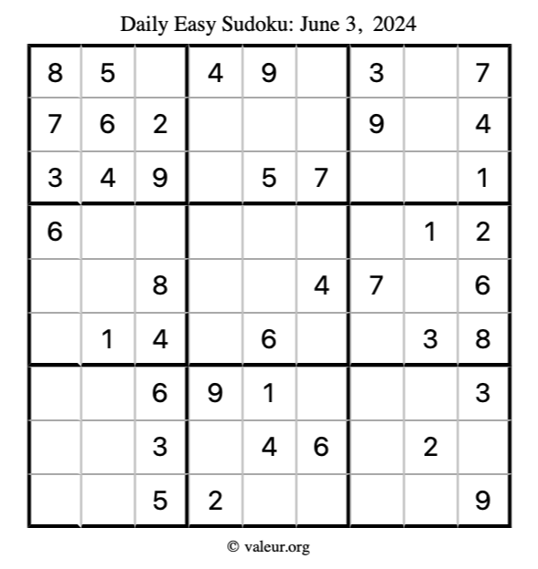 Here is the June 3, 2024 easy sudoku puzzle. You are welcome to print a copy to solve by hand. For your convenience, we have also included the solution further down the page so you can check your work.