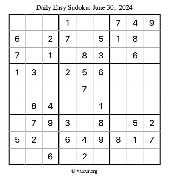 Here is the June 30, 2024 easy sudoku puzzle. You are welcome to print a copy to solve by hand. For your convenience, we have also included the solution further down the page so you can check your work.