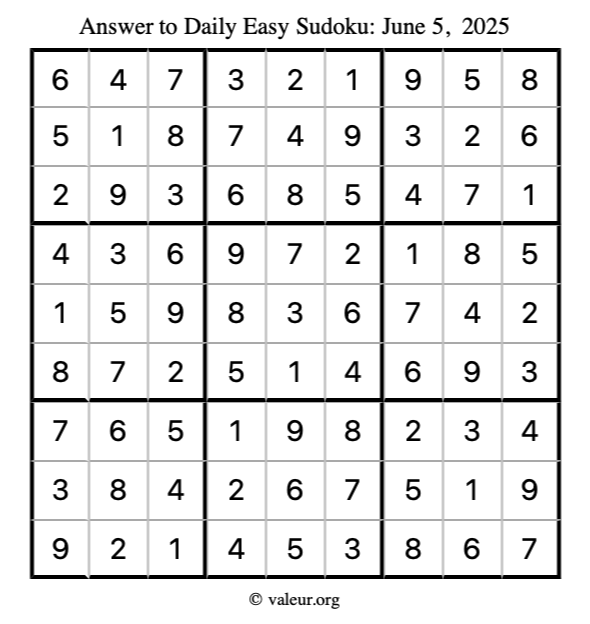 Here is the June 5, 2025 easy sudoku puzzle. You are welcome to print a copy to solve by hand. For your convenience, we have also included the solution further down the page so you can check your work.