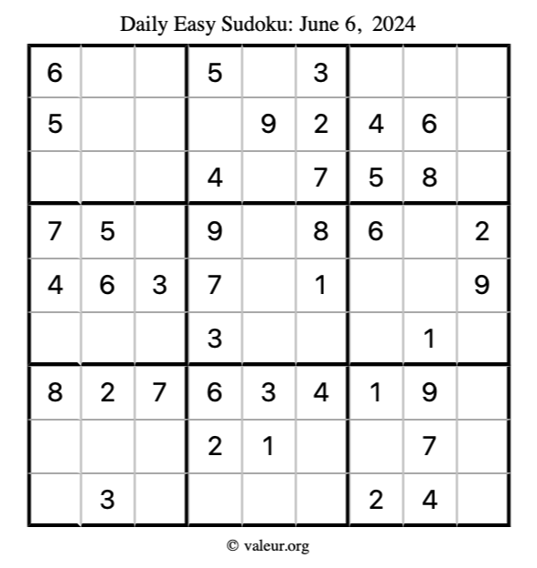 Here is the June 6, 2024 easy sudoku puzzle. You are welcome to print a copy to solve by hand. For your convenience, we have also included the solution further down the page so you can check your work.