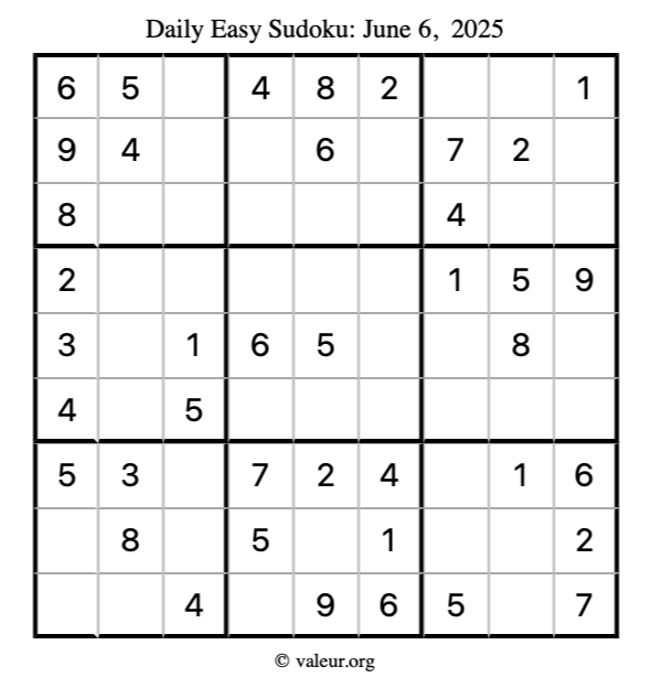 Here is the June 6, 2025 easy sudoku puzzle. You are welcome to print a copy to solve by hand. For your convenience, we have also included the solution further down the page so you can check your work.