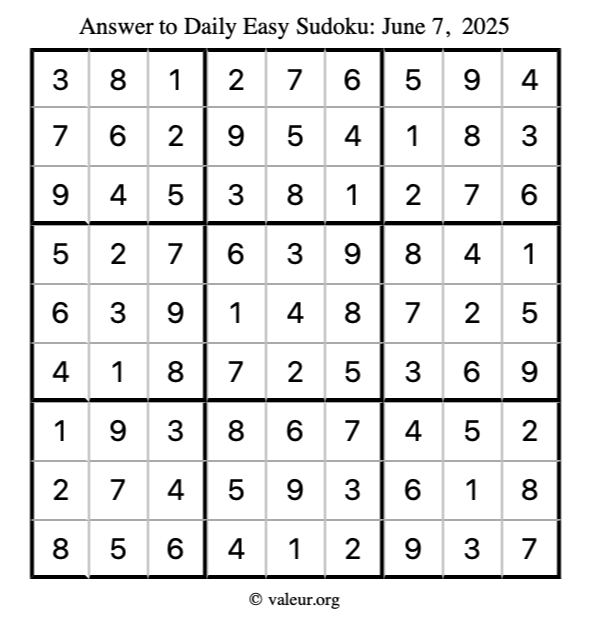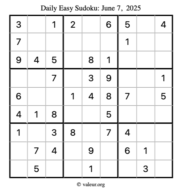 Here is the June 7, 2025 easy sudoku puzzle. You are welcome to print a copy to solve by hand. For your convenience, we have also included the solution further down the page so you can check your work.