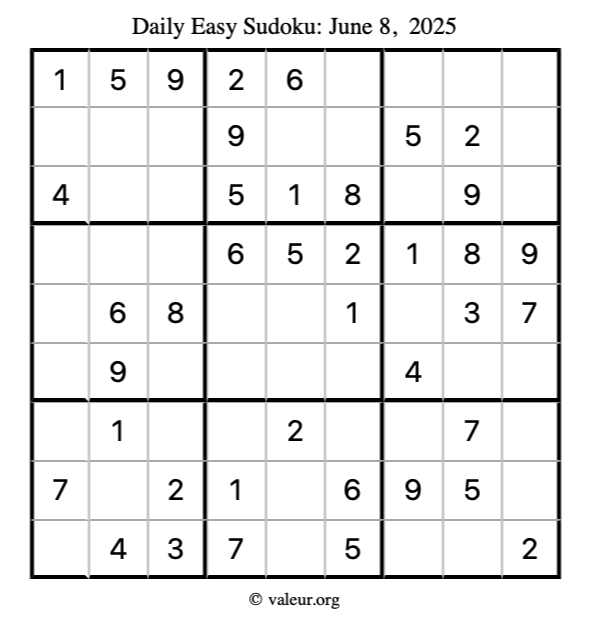 Here is the June 8, 2025 easy sudoku puzzle. You are welcome to print a copy to solve by hand. For your convenience, we have also included the solution further down the page so you can check your work.