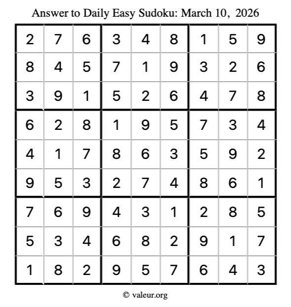 As promised, here is the solution to the March 10, 2026 easy sudoku puzzle: