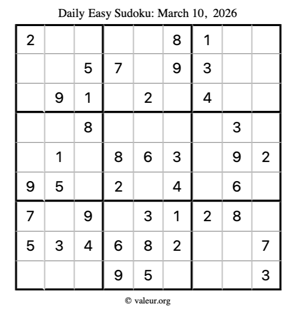 Here is the March 10, 2026 easy sudoku puzzle. You are welcome to print a copy to solve by hand. For your convenience, we have also included the solution further down the page so you can check your work.