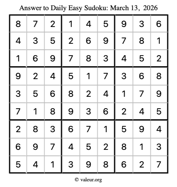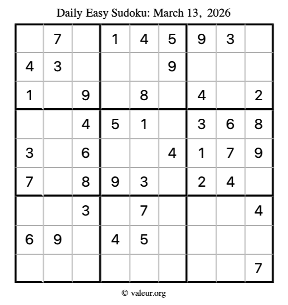Here is the March 13, 2026 easy sudoku puzzle. You are welcome to print a copy to solve by hand. For your convenience, we have also included the solution further down the page so you can check your work.