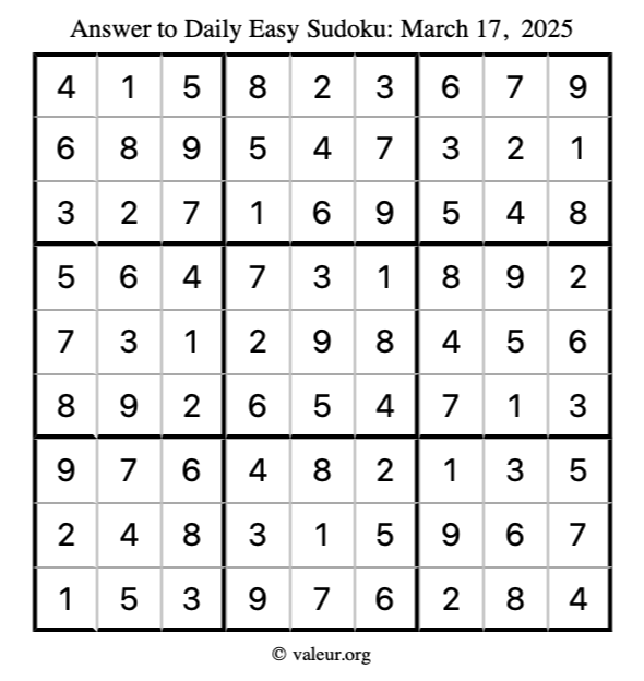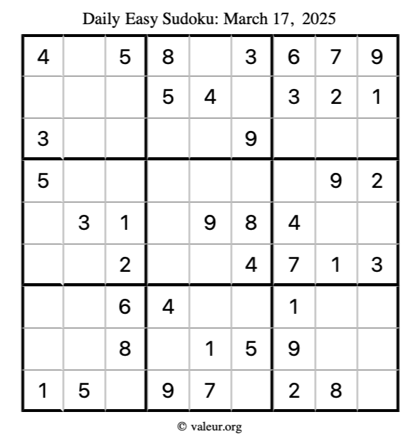 Here is the March 17, 2025 easy sudoku puzzle. You are welcome to print a copy to solve by hand. For your convenience, we have also included the solution further down the page so you can check your work.