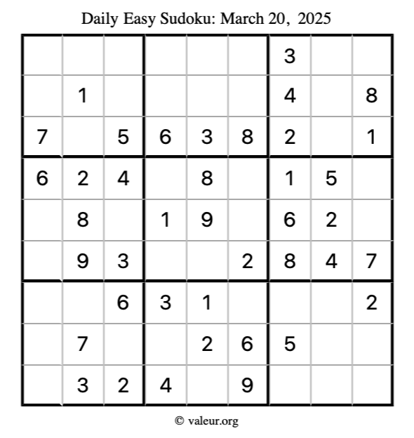 Here is the March 20, 2025 easy sudoku puzzle. You are welcome to print a copy to solve by hand. For your convenience, we have also included the solution further down the page so you can check your work.