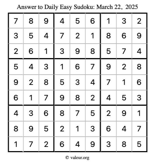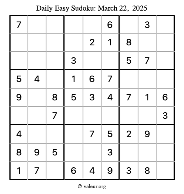Here is the March 22, 2025 easy sudoku puzzle. You are welcome to print a copy to solve by hand. For your convenience, we have also included the solution further down the page so you can check your work.