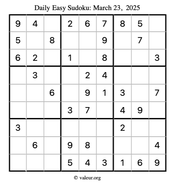 Here is the March 23, 2025 easy sudoku puzzle. You are welcome to print a copy to solve by hand. For your convenience, we have also included the solution further down the page so you can check your work.