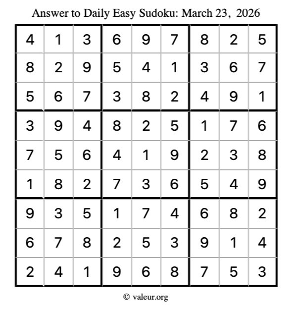 As promised, here is the solution to the March 23, 2026 easy sudoku puzzle: