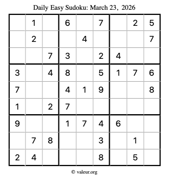 Here is the March 23, 2026 easy sudoku puzzle. You are welcome to print a copy to solve by hand. For your convenience, we have also included the solution further down the page so you can check your work.