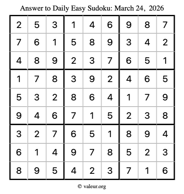 As promised, here is the solution to the March 24, 2026 easy sudoku puzzle: