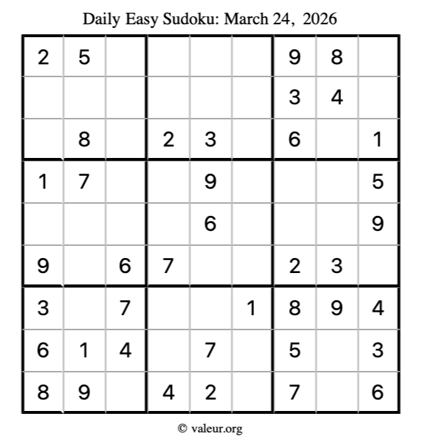 Here is the March 24, 2026 easy sudoku puzzle. You are welcome to print a copy to solve by hand. For your convenience, we have also included the solution further down the page so you can check your work.