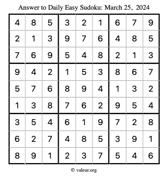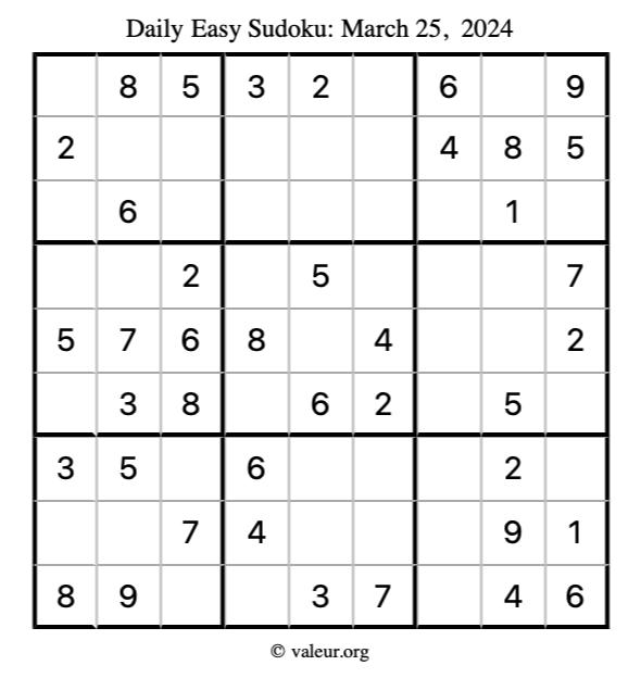 Here is the March 25, 2024 easy sudoku puzzle. You are welcome to print a copy to solve by hand. For your convenience, we have also included the solution further down the page so you can check your work.