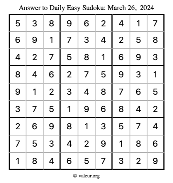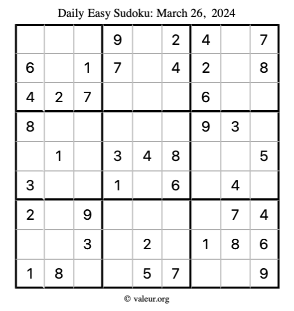 Here is the March 26, 2024 easy sudoku puzzle. You are welcome to print a copy to solve by hand. For your convenience, we have also included the solution further down the page so you can check your work.