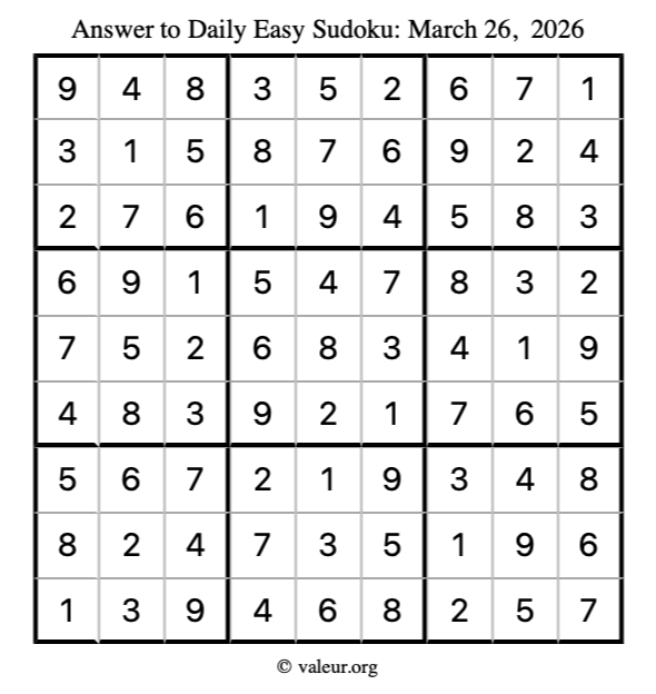 As promised, here is the solution to the March 26, 2026 easy sudoku puzzle: