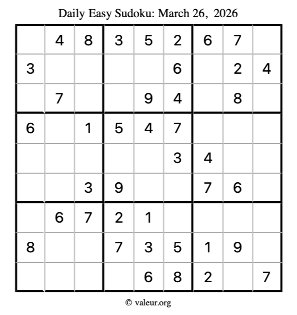 Here is the March 26, 2026 easy sudoku puzzle. You are welcome to print a copy to solve by hand. For your convenience, we have also included the solution further down the page so you can check your work.