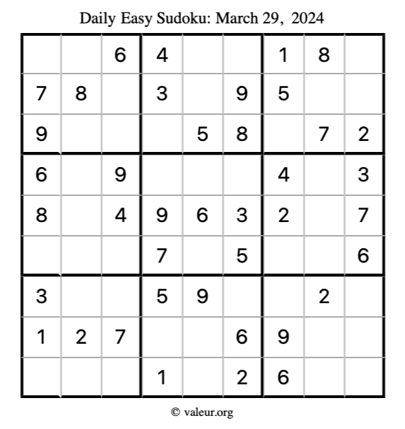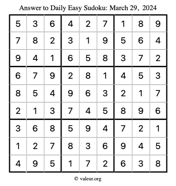 Here is the March 29, 2024 easy sudoku puzzle. You are welcome to print a copy to solve by hand. For your convenience, we have also included the solution further down the page so you can check your work.