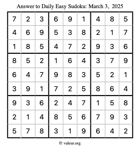 Here is the March 3, 2025 easy sudoku puzzle. You are welcome to print a copy to solve by hand. For your convenience, we have also included the solution further down the page so you can check your work.