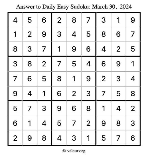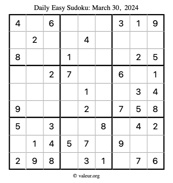 Here is the March 30, 2024 easy sudoku puzzle. You are welcome to print a copy to solve by hand. For your convenience, we have also included the solution further down the page so you can check your work.