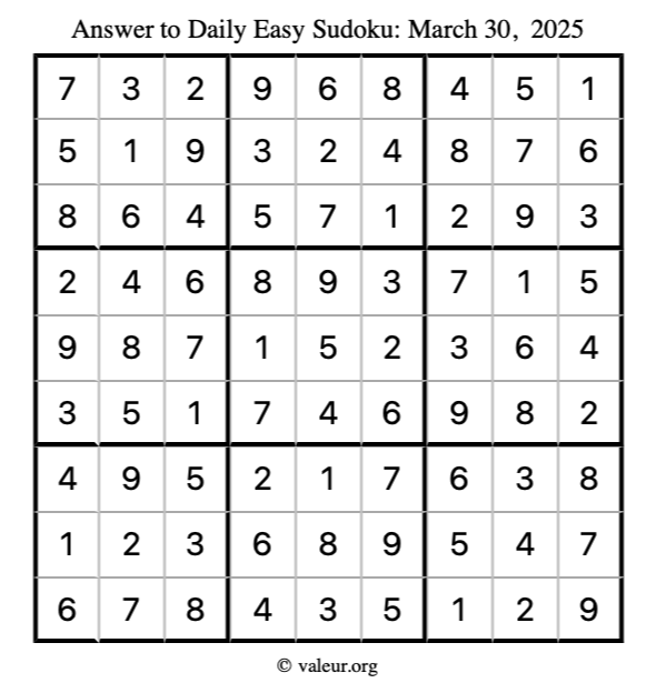 Here is the March 30, 2025 easy sudoku puzzle. You are welcome to print a copy to solve by hand. For your convenience, we have also included the solution further down the page so you can check your work.