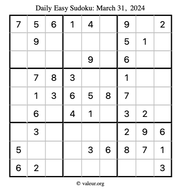 Here is the March 31, 2024 easy sudoku puzzle. You are welcome to print a copy to solve by hand. For your convenience, we have also included the solution further down the page so you can check your work.