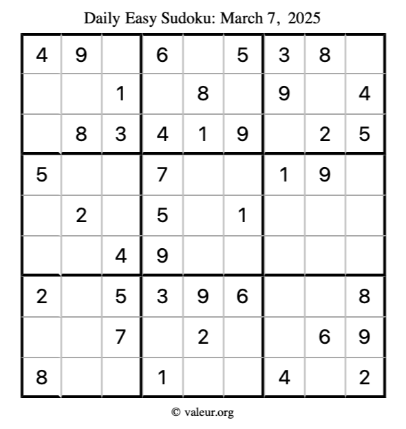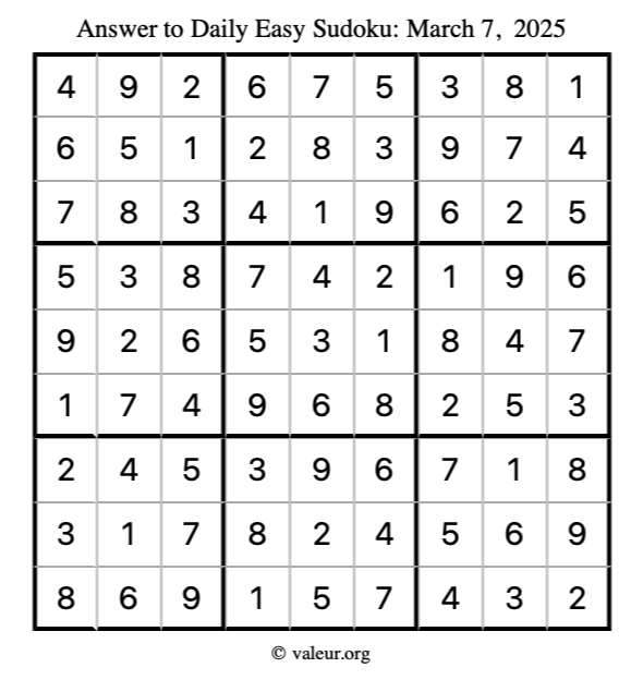 Here is the March 7, 2025 easy sudoku puzzle. You are welcome to print a copy to solve by hand. For your convenience, we have also included the solution further down the page so you can check your work.