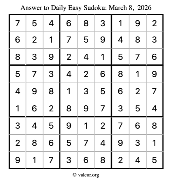 As promised, here is the solution to the March 8, 2026 easy sudoku puzzle:
