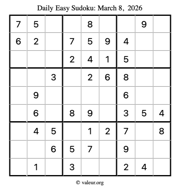 Here is the March 8, 2026 easy sudoku puzzle. You are welcome to print a copy to solve by hand. For your convenience, we have also included the solution further down the page so you can check your work.