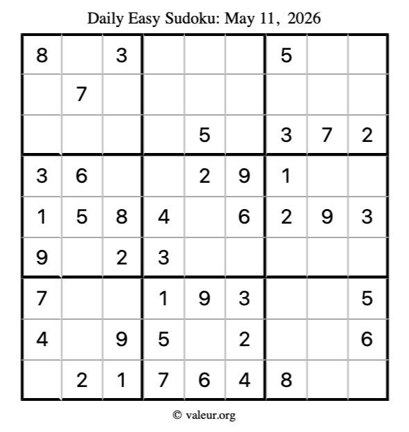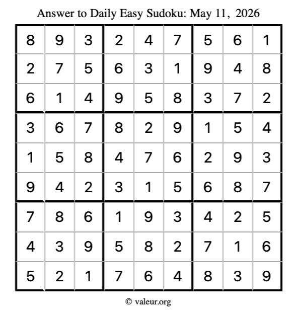 Here is the May 11, 2026 easy sudoku puzzle. You are welcome to print a copy to solve by hand. For your convenience, we have also included the solution further down the page so you can check your work.