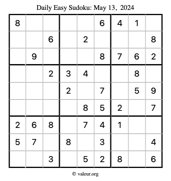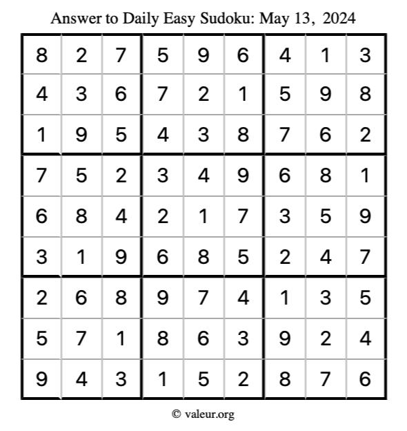 Here is the May 13, 2024 easy sudoku puzzle. You are welcome to print a copy to solve by hand. For your convenience, we have also included the solution further down the page so you can check your work.