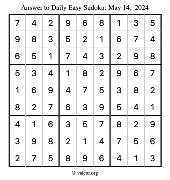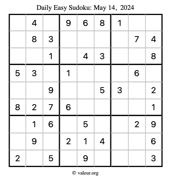 Here is the May 14, 2024 easy sudoku puzzle. You are welcome to print a copy to solve by hand. For your convenience, we have also included the solution further down the page so you can check your work.