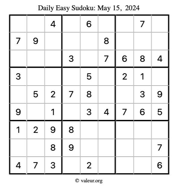 Here is the May 15, 2024 easy sudoku puzzle. You are welcome to print a copy to solve by hand. For your convenience, we have also included the solution further down the page so you can check your work.