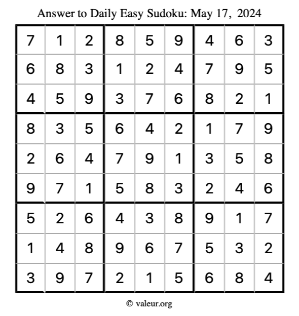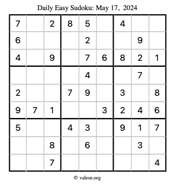 Here is the May 17, 2024 easy sudoku puzzle. You are welcome to print a copy to solve by hand. For your convenience, we have also included the solution further down the page so you can check your work.