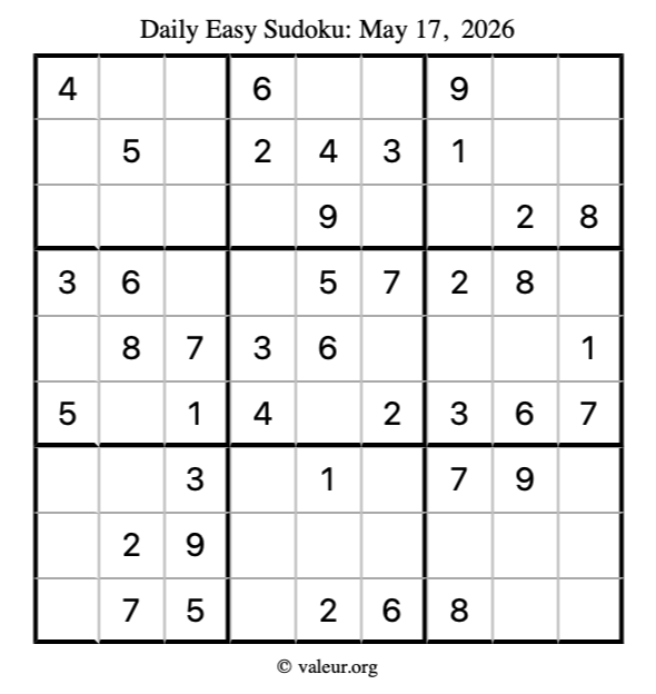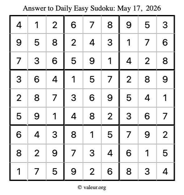 Here is the May 17, 2026 easy sudoku puzzle. You are welcome to print a copy to solve by hand. For your convenience, we have also included the solution further down the page so you can check your work.