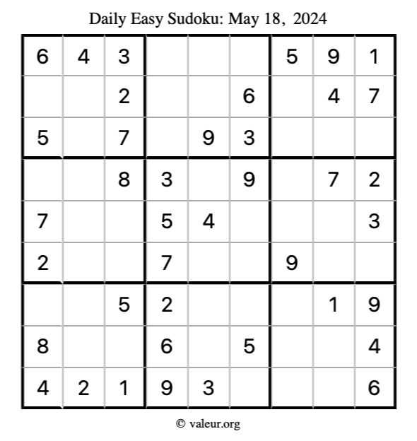 Here is the May 18, 2024 easy sudoku puzzle. You are welcome to print a copy to solve by hand. For your convenience, we have also included the solution further down the page so you can check your work.