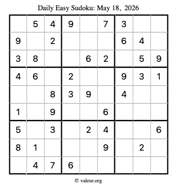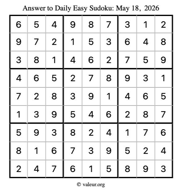 Here is the May 18, 2026 easy sudoku puzzle. You are welcome to print a copy to solve by hand. For your convenience, we have also included the solution further down the page so you can check your work.