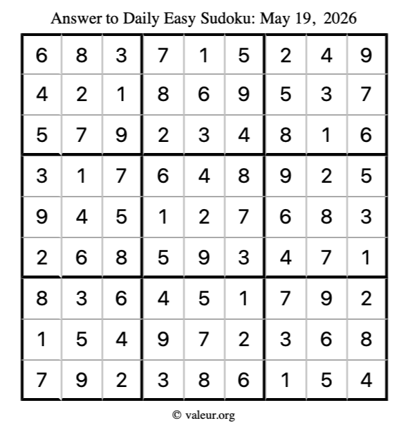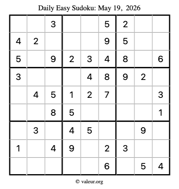 Here is the May 19, 2026 easy sudoku puzzle. You are welcome to print a copy to solve by hand. For your convenience, we have also included the solution further down the page so you can check your work.