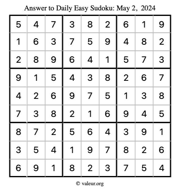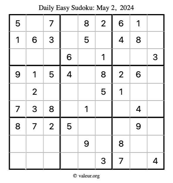 Here is the May 2, 2024 easy sudoku puzzle. You are welcome to print a copy to solve by hand. For your convenience, we have also included the solution further down the page so you can check your work.