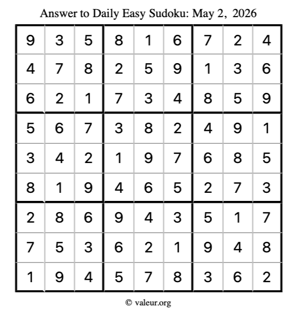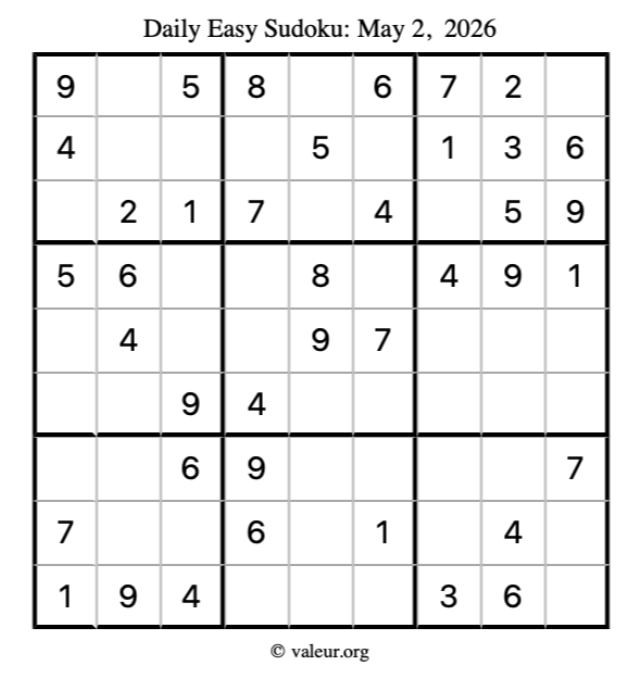 Here is the May 2, 2026 easy sudoku puzzle. You are welcome to print a copy to solve by hand. For your convenience, we have also included the solution further down the page so you can check your work.