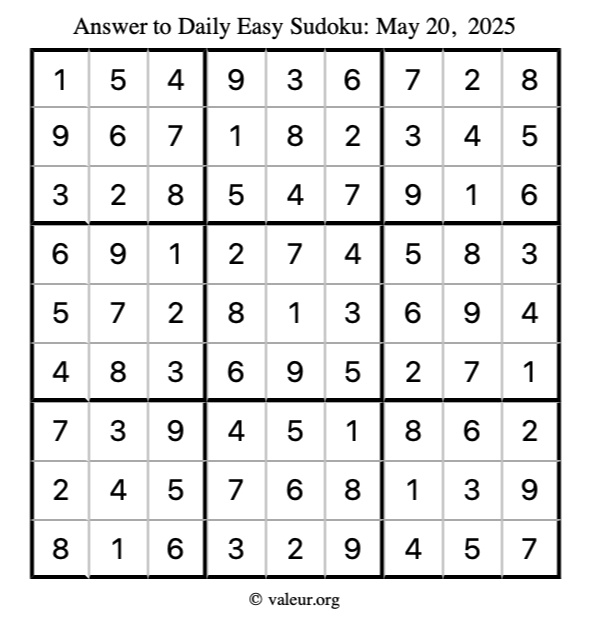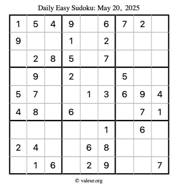 Here is the May 20, 2025 easy sudoku puzzle. You are welcome to print a copy to solve by hand. For your convenience, we have also included the solution further down the page so you can check your work.