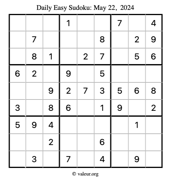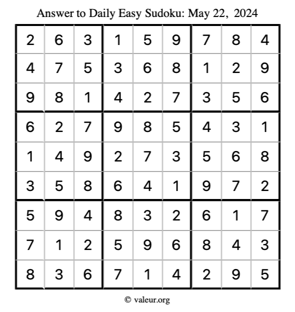 Here is the May 22, 2024 easy sudoku puzzle. You are welcome to print a copy to solve by hand. For your convenience, we have also included the solution further down the page so you can check your work.
