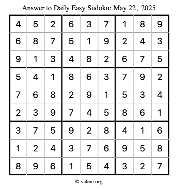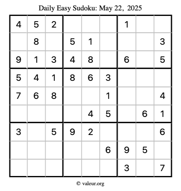 Here is the May 22, 2025 easy sudoku puzzle. You are welcome to print a copy to solve by hand. For your convenience, we have also included the solution further down the page so you can check your work.