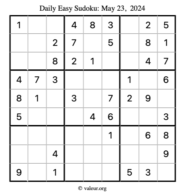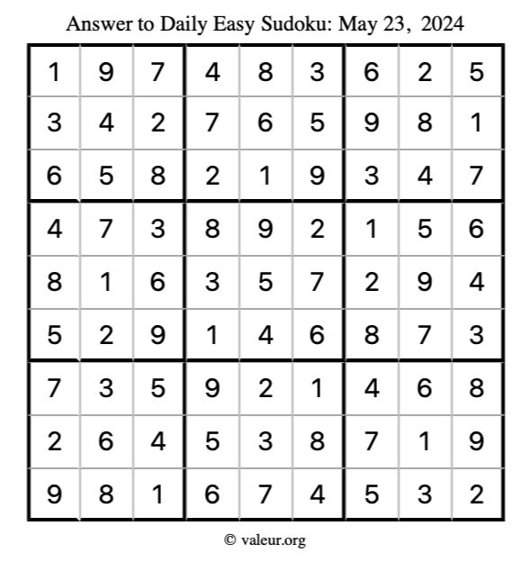 Here is the May 23, 2024 easy sudoku puzzle. You are welcome to print a copy to solve by hand. For your convenience, we have also included the solution further down the page so you can check your work.