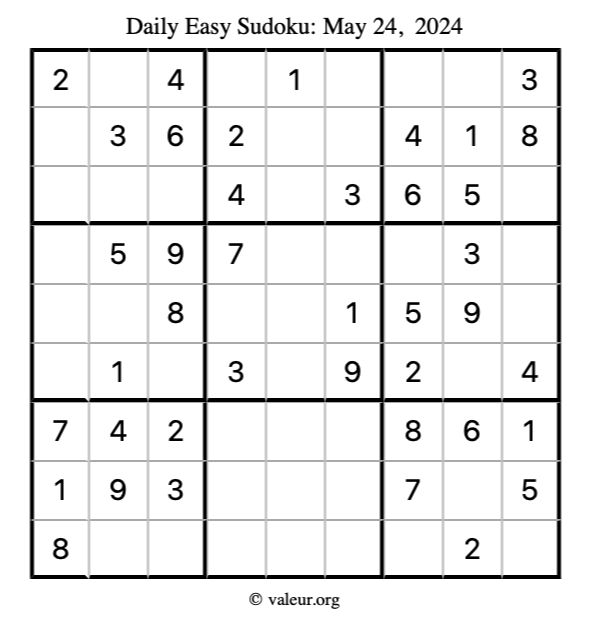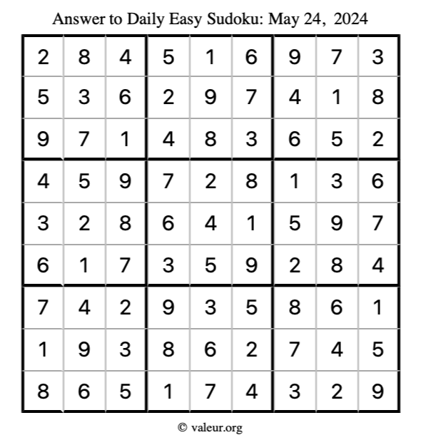 Here is the May 24, 2024 easy sudoku puzzle. You are welcome to print a copy to solve by hand. For your convenience, we have also included the solution further down the page so you can check your work.