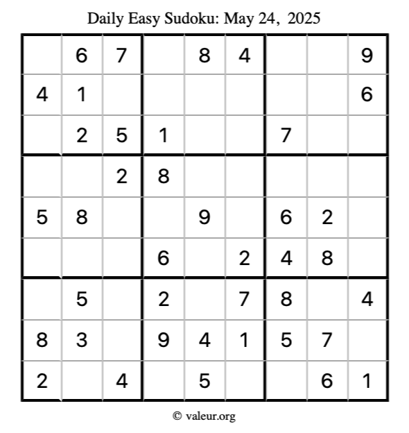 Here is the May 24, 2025 easy sudoku puzzle. You are welcome to print a copy to solve by hand. For your convenience, we have also included the solution further down the page so you can check your work.